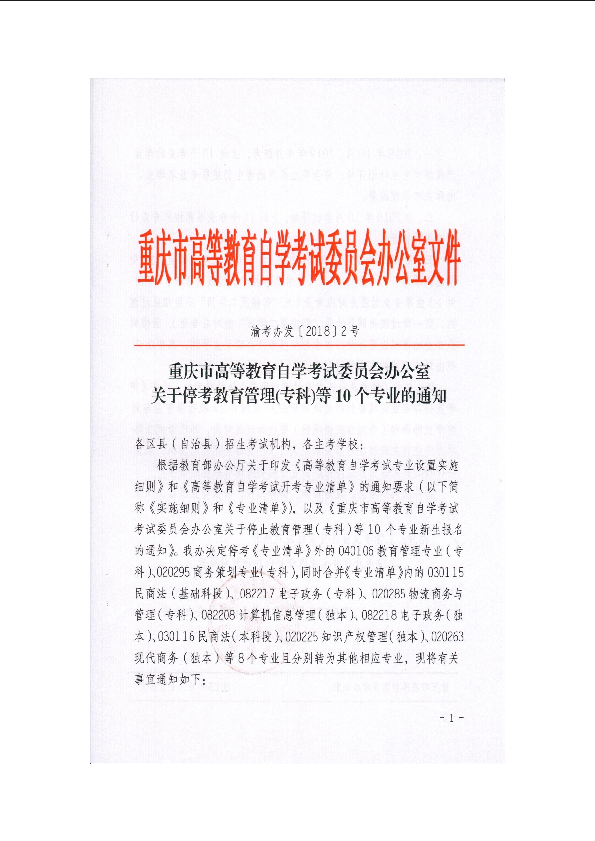 重庆市高等教育自学考试委员会办公室关于停考教育管理(专科)等10个专业的通知
