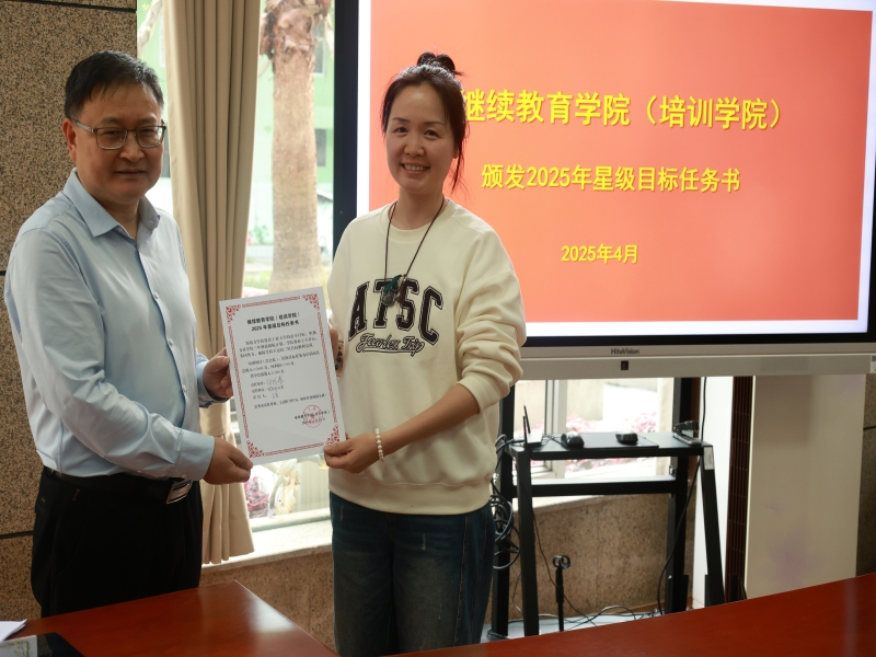 为助力公司建设工业大学的奋斗目标,积极支持公司三年财政提振计划,确保公司下达的三星目标顺利完成,2025 年 4 月 11 日下午,继培公司在志仁楼阅览室举行了2025年星级目标任务书颁发活动。此次活动由继培公司副经理姚晓兰主持,公司党委常委、副董事长李天福教授作为目标责任书颁发人,全体教职工共同参与。