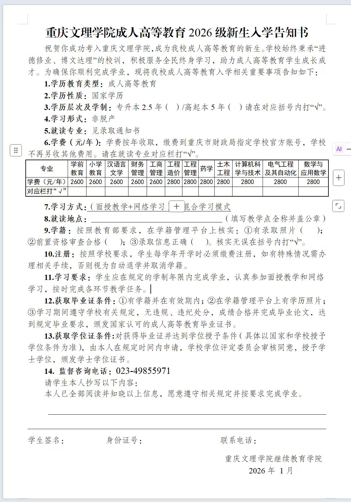 1.2026级新生根据教学点(含校本部)学籍负责人或辅导员的通知,到所在教学点领取录取通知书、填写新生入学告知书(见附件1)、核对新生信息和注册表并确认签字。